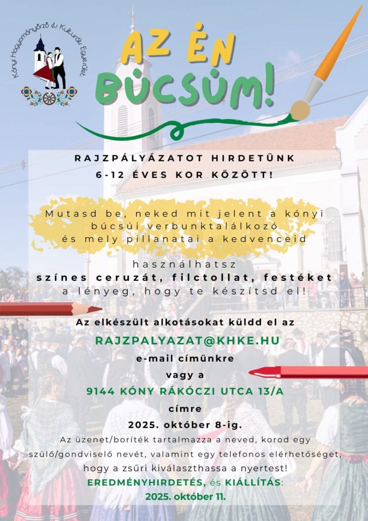 Az elkészült alkotásokat küldd el a rajzpalyazat@khke.hu e-mail címünkre vagy a 9144 Kóny Rákóczi utca 13/A címre 2025. október 8-ig.