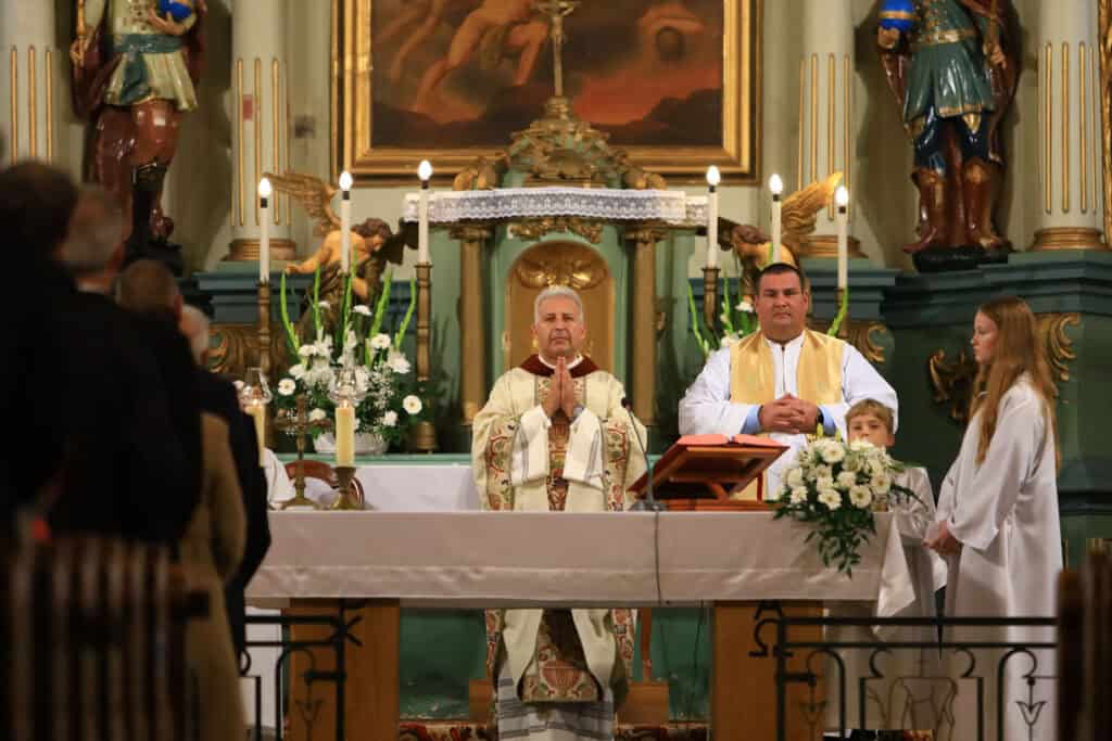 Vasárnap reggel a Tájház udvarán gyülekeztek a kónyi táncosok és vendégeik a reggeli felfrissülés jegyében, valamint egy közös próba erejéig. Ezt követően a csoportok közösen vonultak át a búcsúi szentmisére, amelyet Henczel Szabolcs ezüstmisés atya, a beledi plébános, falunk szülötte, valamint Brezina Balázs plébános úr celebrált.